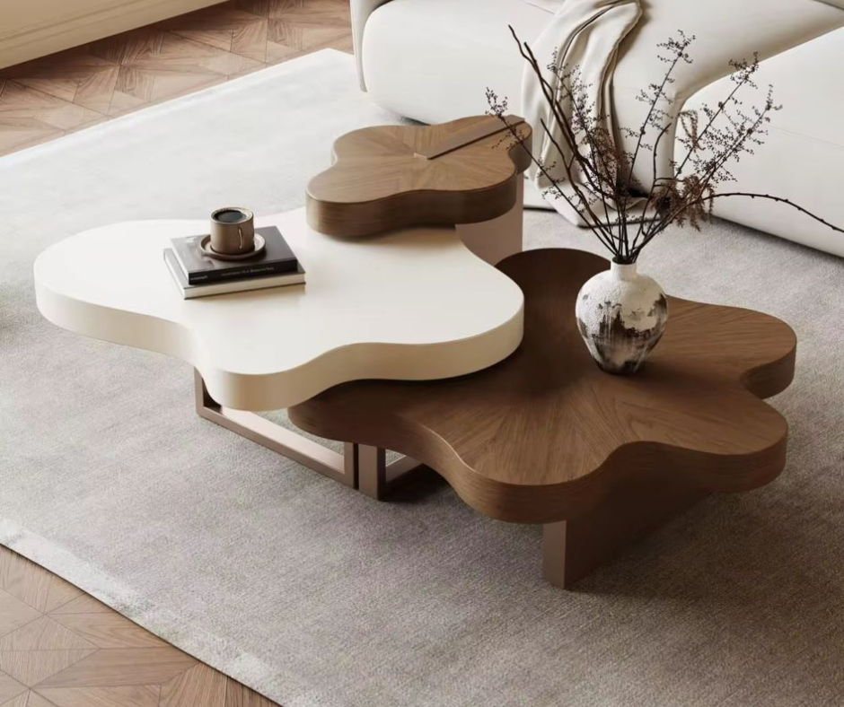 שולחן יוצא דופן המשלב בין עץ טבעי לחומר מודרני, בעיצוב אורגני המזכיר צורה פרחונית מרהיבה. שתי יחידות שונות בגובה ובגודל יוצרות קומפוזיציה דינאמית ומרשימה, שמוסיפה לחלל הסלון עומק ויוקרה. שילוב בין פונקציונליות גבוהה לבין נוכחות עיצובית חזקה – יצירת מופת לכל חלל מודרני.