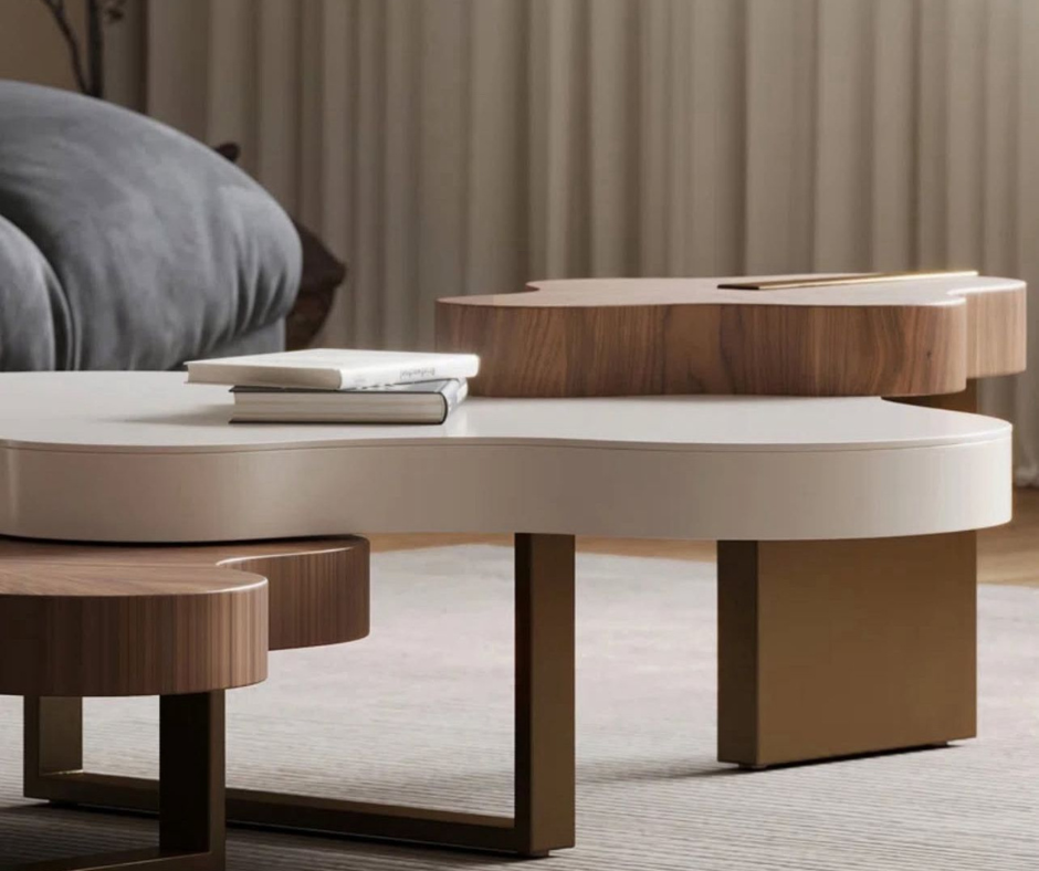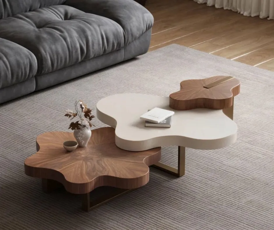 שולחן יוצא דופן המשלב בין עץ טבעי לחומר מודרני, בעיצוב אורגני המזכיר צורה פרחונית מרהיבה. שתי יחידות שונות בגובה ובגודל יוצרות קומפוזיציה דינאמית ומרשימה, שמוסיפה לחלל הסלון עומק ויוקרה. שילוב בין פונקציונליות גבוהה לבין נוכחות עיצובית חזקה – יצירת מופת לכל חלל מודרני.